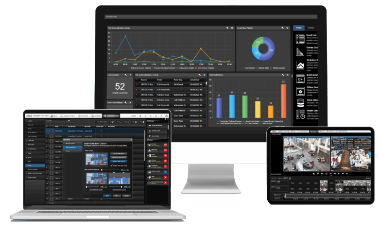 Perspective VMS® is a browser-based software that streams and captures IP security camera video and manages various IP security devices. PVMS includes features such as fleet security management, access control, video analytics, intrusion detection and prevention, gates and barriers, RFID asset management, IoT sensors. PVMS provides advanced features for tracking behavior, movement, and events with comprehensive monitoring for the whole facility.
