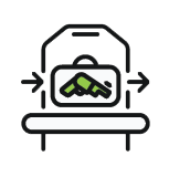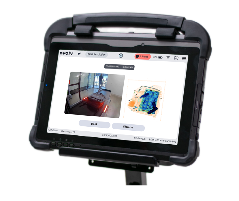 Evolv eXpedite is designed to autonomously scan the bags on the conveyer belt to detect potential threats. The system uses advanced AI and high-speed x-ray imaging technology to distinguish potential threats from many everyday items. If a threat is detected, the green lights on eXpedite turn red and the conveyer