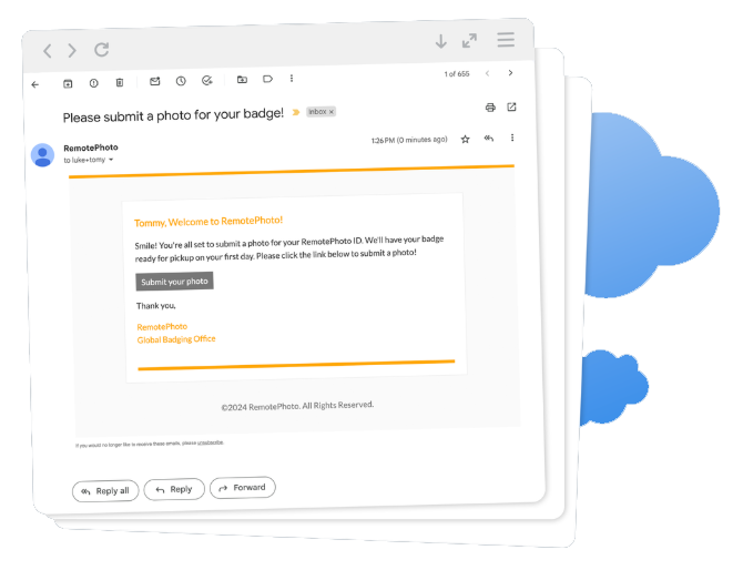 Integrate RemotePhoto with your HR system or onboarding workflow, or provision users instantly through Single Sign-On. After a profile is created, you can choose to send a welcome email inviting badgeholders to submit their photo remotely.