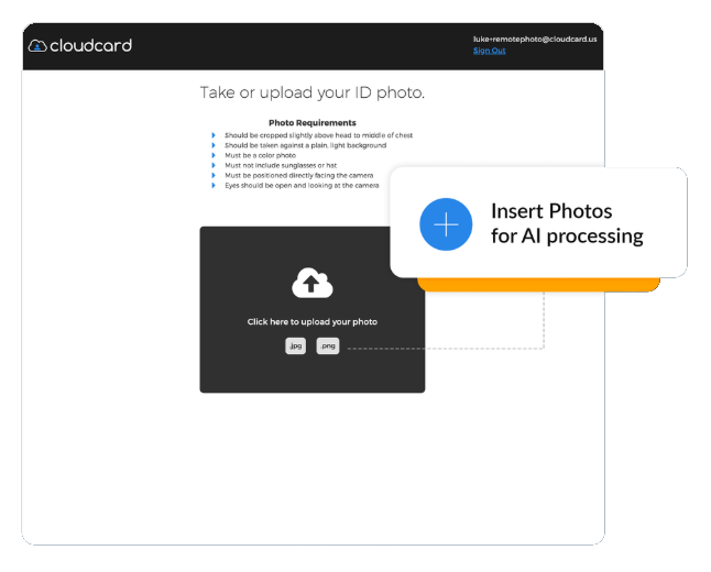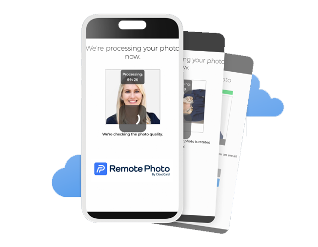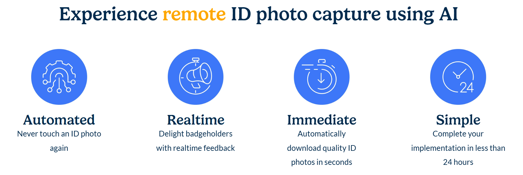 automates the process of capturing photo IDs remotely from anywhere allowing card holders to take a quality selfie photo and submit using a secure link from their smartphone within minutes. Each photo must meet certain criteria to be accepted as a photo ID image to ensure good quality, complete visual representation, lighting, etc. AI technology crops, rotates, removes backgrounds, and approves or denies the photo automatically to support a self-service process for card holders.