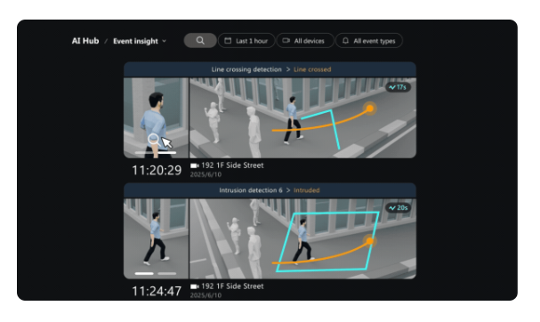 Event Insight transforms how you manage incidents. Visualize alerts with the best snapshots and trigger types, then instantly access all related footage with a single click using Re-search or switch to live view with a built-in shortcut, making investigations faster and more intuitive.