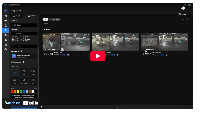 All VORTEX video surveillance cameras come with on-board AI analytics for precise searches, facilitating swift incident investigations.